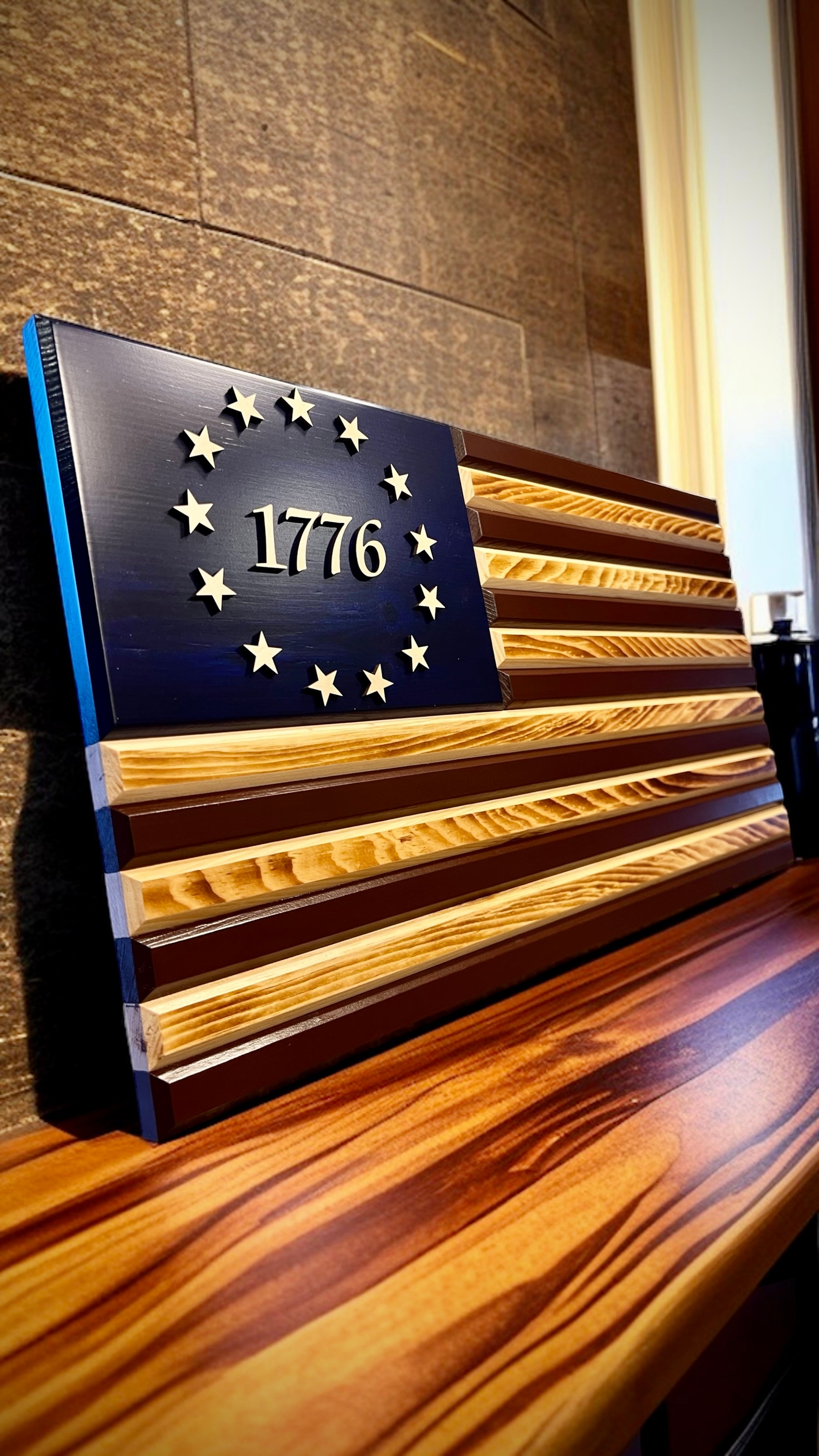 Introducing our handcrafted Betsy Ross Wood American Flag, proudly made in the USA. Measuring 13" by 24", this high-quality flag is perfect for interior display and comes with a convenient hanger on the back. Reinforced with strong wood strips, it ensures a seamless and attractive look. Show your patriotism with style.